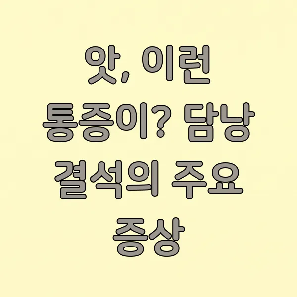 담낭 결석 하면 가장 먼저 떠오르는 게 바로 통증 이죠. 보통 명치 부위 나 오른쪽 갈비뼈 아래쪽 , 그러니까 담낭이 있는 부위가 갑자기 심하게 아파와요. 이걸 '담석 산통'이라고 하는데요, 통증이 얼마나 심하냐면 옆구리까지 뻐근하게 느껴지기도 하고, 심하면 식은땀이 줄줄 흐르기도 할 정도예요. 정말 혼자서는 견디기 힘든 고통이 올 때가 많답니다. 특히 밥 먹고 나서, 기름진 음식을 먹고 나서 더 심해지는 경향이 있어요.